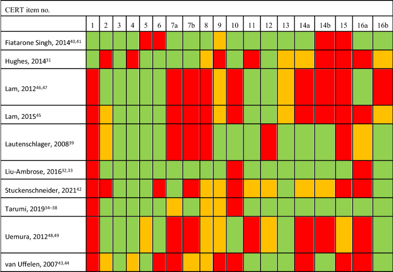 - Colour code: Green = Information was reported, Orange = Information was not clearly reported, Red = Information was not reported; Item 1: Detailed description of type of exercise equipment; Item 2: Detailed description of qualifications, expertise and/or training; Item 3: Description whether exercises were performed individually or in a group; Item 4: Description whether exercises were supervised or unsupervised, how they were delivered; Item 5: Detailed description how adherence to exercise was measured and reported; Item 6: Detailed description of motivational strategies; Item 7a: Detailed description of the decision rule(s) for determining exercise progression; Item 7b: Detailed description of how the exercise program was progressed; Item 8: Detailed description of each exercise to enable replication; Item 9: Detailed description of any home program component, Item 10: Information on inclusion of non-exercise components; Item 11: Description of type and number of adverse events that occurred during exercise; Item 12: Description of setting in which exercises were performed; Item 13: Detailed description of exercise intervention; Item 14a: Description whether exercises were generic (one size fits all) or tailored; Item 14b: Detailed description how exercises were tailored to the individual; Item 15: Description of criteria used to determine starting level; Item 16a: Description how adherence or fidelity was assessed/measured; Item 16b: Description of extent to which intervention was delivered as planned.