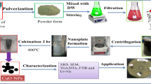 Figure 1B shows the synthesis of CuO NPs from Morinda citrifolia leaf extract solution. 2.5 g of CuSO4·5H2O was dissolved in 100 mL of Deionized water (DI) to initiate the green synthesis process for CuO NPs. After, 50 mL of Morinda citrifolia extract solution to 100 mL of 1 × 10–2 M CuSO4·5H2O solution, the pH was kept at 7.0 with NaOH. The solution then underwent to a reflux at a magnetic stirrer. The colour of the solution changed as it was stirring with a from pale-green to a deep-brown while maintaining for 5 h at 70 °C. After centrifuging the solution for 24 h, it was filtered. The solid precipitate was washed three times with deionised water, followed by an 100% ethanol wash for CuO NPs separation, dried at 60 °C for 4 h, and kept at 4 °C for further application.