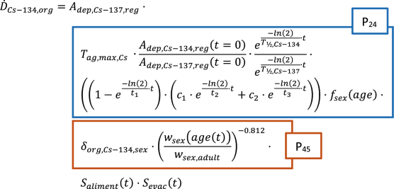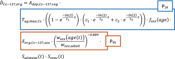 The coefficients δorg,Cs-137,sex and δorg,Cs-134,sex are implemented in LARCalc in the aggregate transfer functions between ground deposition and internal organ-specific absorbed dose resulting from the intake of contaminated foodstuff (corresponding to the transfer parameter P25 defined by UNSCAR15) according to Eqs. (12) and (13). Note that the time integral of P25 is given by the product of \({\int }_{0}^{{t}_{acc}}{P}_{24} \cdot {P}_{45}\cdot dt\), and that P24 corresponds likewise to P23 and P34 in Fig. 1.