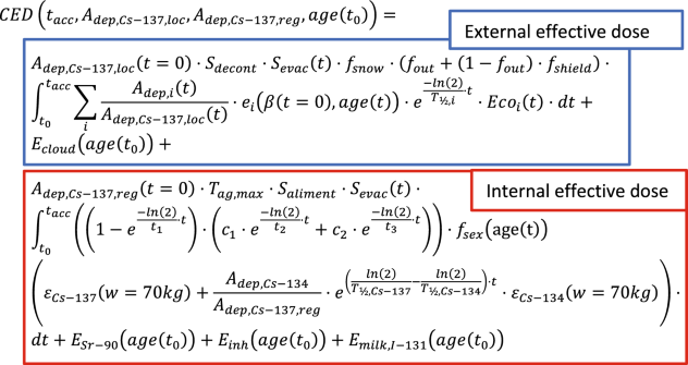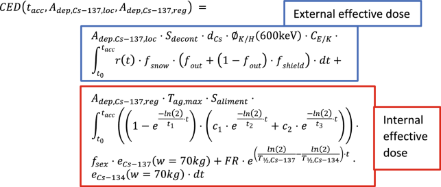 where tacc (y) is the time considered for integration of the dose rate after the initial fallout at t = 0. In Table 1 is given a further explanation of the other parameters. Note that the first term on the right-hand side of Eq. (1) refers to the external dose contribution from the local ground deposition, Adep,Cs-137,loc (kBq m-2), and the second term refers to the internal dose contribution from radioecological transfer of regional deposition of 137Cs (represented by the quantity Adep,Cs-137,reg (kBq m-2)).