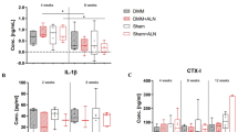 Following fixation, right hind paw samples were decalcified in a solution of formic acid, nitric acid, and distilled water for 24 h, and embedded in paraffin. Then, 5 μm frontal sections were taken through the entire joint and stained with Hematoxylin–Eosin or Safranin O/Fast Green for histological analysis. Slides were examined by two blinded independent investigators using a Leica DM4000B microscope equipped with a Leica DFC420 camera. Degradation of femoral condyle and tibial plateau cartilage was quantified with the OARSI score37, which is the primary outcome of the study. In addition, a five-tier system (0–4) was used to evaluate the proteoglycan content (0 = no loss of proteoglycan staining relative to a normal control, 1 = minimal loss, 2 = mild loss, 3 = moderate loss and 4 = total loss of pro-teoglycan staining)38. Three slides per joint were used to generate each data point.
