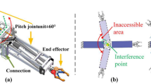 The gyroscope can detect the body angle to the CPG model in real time, where \(offset_{g}\) represents the parameters to feedback this information, and \({\text{K}}_{r}\) represents the feedback gain. For the first joint angle of the robot, \(\theta\) represents the yaw angle measured in real time, and \(\theta_{o}\) represents the stable body yaw angle of the robot. For the other joint angles of the robot, \(\theta\) represents the pitch angle measured in real time, and \(\theta_{o}\) represents the stable body pitch angle of the robot. If the robot approaches an upward or downward inclination road, its yaw and pitch angle changes quickly. The gyroscope will detect this information and feed it back to the CPG model immediately. If the body angle deviates from the stable range, \(offset_{g}\) will rise to a high value to control the CPG model to generate a high cyclic period until the body angle returns to the stable range. At this time, \(offset_{g}\) becomes the original value again. By means of this concept, the robot can overcome the terrain condition through adaptive rhythmic joint motion.