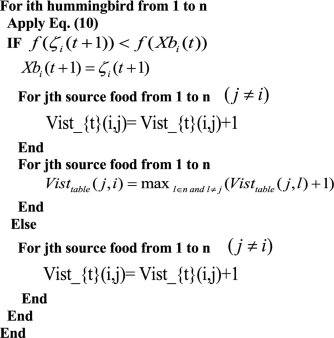 Visit table: A table is maintained to record the visit history of different hummingbirds to each food source, indicating the duration since a particular bird last fed from it. When a hummingbird decides to feed, it prioritizes a food source with a high visit level for that specific bird. If multiple food sources have the same highest visit level, the bird selects the one with the highest nectar-refilling rate to obtain more nectar. This visit table helps each hummingbird to locate its preferred food source. Typically, the visit table is updated after each feeding loop.