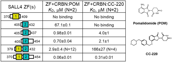 Table 1 SPR affinities for the interaction of SALL4 zinc fingers 1, 2, or 1–2 with immobilized DDB1:CRBN complexed with pomalidomide (POM) or CC-220 at 5 μM.