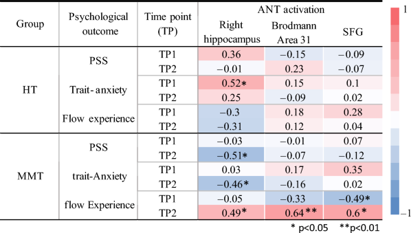 Table 3 Correlations observed between the psychological outcomes (PSS, trait anxiety, and flow experience) and the training-related increased brain activations (right hippocampus, Brodmann area 31, and SFG) in the HT and MMT group for both TP1 and TP2.