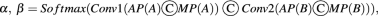 In the spatial attention sub-module, as shown in Fig. 4b, we also start with average pooling (AP) and maximum pooling (MP), but the difference is that this time the pooling operation is done on the channel axis. We concatenate two outputs and use \(1 \times 1\) convolution to change channels to 1. We concatenate the results from inputs A and B, and use a Softmax activation function to produce the attention weights: