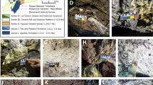 The secondary minerals were kept intact on the basaltic surfaces for SWIR analyses prior to powdering in order to acquire hyperspectral images of the mineral distribution on the basaltic surfaces of the samples to mimic non-destructive in-situ measurements. The SWIR spectra have broad absorption peaks at ~ 1450 and ~ 1930 nm associated with H2O and the broad stair step band at ~ 2200 to 2360 nm corresponding to Si–OH vibrations, which is characteristic for opal or hydrated quartz (Fig. 3). However, absorption features that are characteristic for calcite are not observed in the hyperspectral SWIR images and spectra opposed to FTIR and XRD analyses, which were powdered prior to analysis and showed a mix of calcite and opal. Furthermore, SWIR spectra of white coatings of basaltic rock samples show similar spectra as the gypsum or opal spectra of the samples analysed in this study. FTIR spectra of the coralloid speleothems display mainly strong absorbance of Si–O bending vibrations at ~ 1100 cm−1, corresponding to opal, and of the υ2 at ~ 870 cm−1 and υ3 at ~ 1404 and ~ 1412 cm−1 CO32− bending vibrations corresponding to calcite (Fig. 5H, I). Small absorbance peaks at ~ 780 cm−1 in the speleothem samples correspond with Si–O stretching in the Si–O–Si groups. The split peak at ~ 1404 and ~ 1475 cm−1 and the small peak at ~ 871 cm−1 in Fig. 5I corresponds to the υ3 and υ2 vibrations of monohydrocalcite. Additionally, the intensity and shape of the absorbance peak corresponding to the O–H stretch at ~ 3500 cm−1 varies with each coralloid speleothem sample.