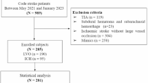 In patients with ischemic stroke, the initial clinical severity was graded using the National Institute of Health Stroke Scale (NIHSS), measured three times daily during acute stroke unit care and then once daily until discharge. END was classified as an increase in the NIHSS score by 2 or more points within 7 days post-admission11. Functional outcomes were graded at 3 months using the modified Rankin Scale (mRS) score. New ischemic stroke or SAH events that occurred during or after hospital admission were also identified.