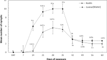 The ANOVA revealed a significant difference in the mortality of adult females of D. opuntiae induced by different bacterial strains and their application with black soap for different exposure periods (p < 0.001; Fig. 4). The mortality of adult females for different bacterial isolates increased with increasing concentrations for different exposure times. In 6 days after application, P. koreensis strain 66Ms-04 at (108 CFU/mL) combined with black soap (60 g/L) demonstrated the high level of mortality of adult females’ with 75.00%. The highest levels of D. opuntiae adult females’ mortality (80%) was recorded by application of P. koreensis strain 66Ms-04 (108 CFU/mL) in combination with black soap, 8 days after application, followed by P. koreensis strain 66Ms-04 applied alone (66.75%) (Fig. 4).