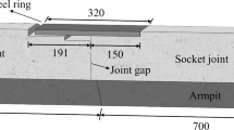The experiment measures the applied load at the joint, the displacement at multiple locations along the pipe section, and the strain values of the concrete, steel ring, and steel cages at the joint. As depicted in Fig. 5, strain gauges, rod displacement meters, and pull wire displacement meters are installed at the joint to examine the deformation of the concrete, steel ring, and steel cages during loading. The strain gauge has a resistance of 120 Ω, a sensitivity coefficient of 2.0 ± 0.01, and a strain limit of 20,000 µm/m. The measurement range of the pull wire displacement meter is 0–1250 mm, with a linearity of ± 0.5%. The deformation calculation formula is as follows: