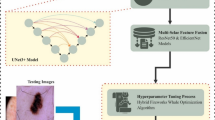 Skin cancer is caused by abnormal cells and can metastasise quickly if not detected early1. Of the number of studies on melanoma using different analytical platforms, one of the pioneering efforts is Computer-Aided Diagnosis (CAD)2. These research efforts used automated algorithms to identify cutaneous lesions upfront by analysing image colour, shape, and structure3,4. Image segmentation is still a prominent field of study—the progression of segmentation by statistical analysis of medical images5. Extraction of characteristics from the lesion region assists in categorisation, although developing such systems has been challenging and sluggish6. The majority of automated detection systems use the Asymmetry, Border, Color, Diameter, and Evolution (ABCDE) rule. In 2001, Senan et al. were the first to work with the four aspects of this technique, which involved 122 parameters, and used the conventional models with an automation system employed7. Squamous-cell carcinoma (SCC), basal-cell carcinoma (BCC), and melanoma are the three kinds of skin cancer8; the former two are less prevalent types and are grouped as non-melanoma skin cancer. While BBC develops slowly, possibly causing tissue damage, it seldom causes mortality and is usually seen in the nasal cavity9,10. Squamous-cell skin cancer manifests as a hard mass with a scaly surface and crust, which may lead to the formation of an ulcer11. Melanoma is the deadliest and most severe type of skin cancer that can metastasise and become chronic and life-threatening if not diagnosed and treated early. Asymmetry, uneven borders, numerous colours, and distinctive dermoscopic structures are typical melanoma symptoms12.