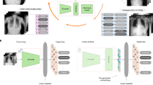 The diagnostic labels of interest included cardiomegaly, pleural effusion, pneumonia, atelectasis, consolidation, pneumothorax, and no abnormality. To align with previous studies13,25,42,43, we implemented a binary multi-label classification system, enabling each radiograph to be assigned a positive or negative class for each imaging finding. As a result, labels from datasets with non-binary labeling systems were converted to a binary classification system. Specifically, for datasets with certainty levels in their labels, i.e., CheXpert and MIMIC-CXR, classes labeled as “certain negative” and “uncertain” were summarized as “negative”, while only the “certain positive” class was treated as “positive”. To ensure consistency across datasets, we implemented a standardized multi-step image pre-processing strategy: First, the radiographs were resized to the dimension of \(224\times 224\) pixels. Second, min–max feature scaling, as proposed by Johnson et al.35, was implemented. Third, to improve image contrast, histogram equalization was applied13,35. Importantly, all pre-processing steps were carried out locally, with each institution applying the procedures consistently to maintain the integrity of the federated learning framework.