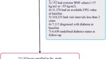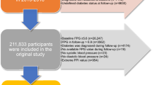 Our primary outcome was the occurrence of prediabetes, defined by FPG levels in the range of 6.1–6.9 mmol/L at follow-up without reported incident diabetes2.