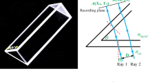 where \(\Gamma (x, y, z)\) represents the reconstructed complex wavefront with coordinates (x, y, z), \(\mathscr {F}\) denotes the Fourier transform, \(E_{R}^{*}\) is the complex conjugate of the reference wave, h is the captured hologram, \(\lambda\) is the wavelength of illumination light, and \(f_{x}\) and \(f_{y}\) are the transverse spatial frequencies.