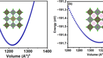 Subsequent to the stability assessment, the ensuing step entails the determination of key structural parameters, encompassing the equilibrium lattice constant (a0), the bulk modulus (B), and its corresponding pressure derivative (B'0). This is accomplished through the computation of the total energy as a function of the unit cell volume (E(V)). To scrutinize this correlation, a fitting procedure is applied utilizing the Birch-Murnaghan equation, formulated as a second order expression, given as29: \(E(V)={E}_{0}+\frac{9{B}_{0}{V}_{0}}{16}\left\{\left[{\left(\frac{{V}_{0}}{V}\right)}^{2/3}-1\right]\right.B{^{\prime}}_{0}+{\left[{\left(\frac{{V}_{0}}{V}\right)}^{2/3}-1\right]}^{2}\left.\left[6-4{\left(\frac{{V}_{0}}{V}\right)}^{2/3}\right]\right\}\). In this context, the symbol \(E(V)\) represents the ground state energy corresponding to the cell volume V, with V0 representing the equilibrium volume. The term E0 signifies the total equilibrium energy, while B and B'0 denote the bulk modulus and its pressure derivative, respectively. The optimized volume-energy plots, as illustrated in Fig. 2a, facilitate the determination of crucial structural parameters, including the lattice constant (a0), bulk modulus (B), and its pressure derivative (B'0), achieved by identifying the minimum point on the E(V) curve. The computed values of all these parameters are presented in Table 1, along with previously published experimental and theoretical results for analogous materials. Significantly, the generalized gradient approximation (GGA) approximation yields a lattice parameter value that closely aligns with the experimental value and other theoretical findings16,26,30. Furthermore, X-ray diffraction (XRD) spectra for Cs2MGaBr6 perovskites, utilizing the optimized structures, have been generated through simulations conducted with the VESTA Crystallographic Software, as depicted in Fig. 2b. The simulated X-ray diffraction (XRD) patterns exhibit notable concordance with experimentally obtained XRD patterns of analogous materials, like Cs2NaBiBr6 halide perovskite30, providing valuable insights for advancing further experimental investigations into these materials.