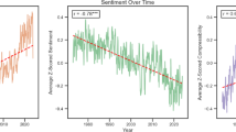 Concerning emotion descriptors, the musical genre in which these play the most important role is rap, followed by R&B. For R&B the results show that the content of the lyrics becomes more negative with time, as shown by the increase in concepts related to anger and a detriment in positive emotions (cf. \(\beta = 1.91\) and \(\beta =-0.89\), respectively, in Table 4). Differently, for rap, there is a general increase in the use of emotion-related words with time, both negative and positive (cf. positive \(\beta\) for all the emotion descriptors), which indicates a tendency towards the use of more emotional words. Confirming outcomes from previous work13, as shown for R&B, also for pop and country, a tendency toward more negative lyrics is displayed over time; for rock, emotion seems to play a negligible role in the evolution of lyrics. As a final note, we would like to emphasize that since both the overall and block-wise adjusted R\(^{2}\) are very low, these results should be interpreted cautiously, and taken as tendencies rather than strong differences and could partly result from partly non-randomness in subsampling.