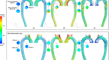 It is worth highlighting that due to the pulsatile flow behaviour, TAWSS would represent a more meaningful biomarker of the endothelial cell damage compared to PSWSS. Therefore, Fig. 7a shows the TAWSS variation, where in most parts of the aorta, the values are within a standard physiological range of the TAWSS which can be considered to be between 0.4–2.5 Pa40. For both native and mechanical valves, the subclavian and carotid arteries exhibit much higher TAWSS levels40. In the case of the native valve, the aortic wall near the valve’s leaflet exhibits higher TAWSS values (marked in red), while a low TAWSS zone is observed near the valve region (marked in red) and at the ascending aorta (Fig. 7b). In the case of the aortic arch, the curvature of the vessel generates complex flow patterns that can result in high wall shear regions near the inner wall of the arch.