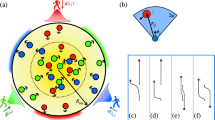 In this study, we aim to elucidate the physical mechanisms underlying the cognitive self-steering of pedestrians (or birds) in moderately dense crowds with nearly homogeneous spatial distribution. We consider a highly simplified model of cognitive self-steering particles (intelligent active Brownian particles, iABPs), which move with constant speed \(v_0\), can sense their environment by visual perception, and react by applying a limit steering torque (“maneuverability”), but have no memory (and thus cannot estimate the speed of neighboring particles nor their direction of motion)24,25,26. Thus, our iABPs have to base their decisions on the redirection of motion entirely on the instantaneous position of their neighbors. Similar self-steering mechanisms have been considered in models of social interactions in animal groups27. We want to emphasize that our torque-based steering mechanism is different from the short-distance repulsion of some other swarming and flocking models, which employ a conservative repulsive interaction potential28. We perform extensive agent-based simulations to analyze iABP dynamics at finite density, in order to explore the complex interplay between particle density, activity level, maneuverability, vision angle, and vision range. Key factors such as the distance to the nearest neighbors, exposure time, and persistence in velocity direction are analyzed. The simulation results are compared with the results of recent experiments on pedestrians in a room, to gain insights to which extent our simple model is able to reproduce and explain pedestrian behavior under the imperative of maximizing distance.