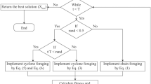 where \({\varvec{x}}_{rand}^{d} \left( t \right)\) is the random location of random production, \({\varvec{L}}_{b}^{d}\) and \({\varvec{U}}_{b}^{d}\) are the lower and upper bounds of the search space, respectively. A sectional drawing of the cyclone foraging behavior is presented in Fig. 3.