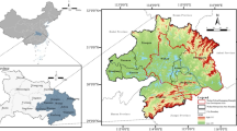 The data used in this study mainly included administrative division, DEM, slope, land use, NDVI etc. The administrative vector data was derived from BIGEMAP map downloader (http://www.bigemap.com/), and DEM digital elevation data from geospatial data cloud (https://www.gscloud.cn, resolution 30 m × 30 m). Based on DEM and ArcGIS10.7, the slope data was processed through inlaying, mask extraction and projection, and finally obtained by means of 3D Analyst tool, for instance, raster surface. On the basis of the Landsat 8OLI_TIRS remote sensing image (https://www.usgs.gov, resolution 30 m × 30 m, cloudcover 1.13%) in March 2021, the land use data was extracted by the interpretation of ENVI5.3 supervised classification, in combination with visual observation. Combined with the field investigation, the data interpreted was revised and proofread repeatedly. Finally, land use types were generated based on the ArcGIS10.7, including 6 types of woodland, water body, grassland, cultivated land, construction land and other land according to the current national classification standard15, and the confusion matrix was used to verify the accuracy. The overall accuracy reached 86.30% and the Kappa coefficient was 0.8, which met the needs of this research. The NDVI data was based on Landsat8OLI_TIRS remote sensing image (https://www.gscloud.cn, resolution 30 m × 30 m, cloudcover 1.13) in March 2021 and calculated by ENVI5.3.