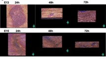 Eight-week-old female ICR mice were used. Vaginal plugs were checked twice daily. The day when a plug was observed was designated as E0, and the fetuses were wounded on E13, E15, and E17. Surgeries were performed on five pregnant mice at each time point. Pregnant mice were anesthetized with 3% isoflurane, and the abdominal wall was incised to expose the uterus. Using an operating microscope, the myometrium and amniotic and yolk sacs were incised. Thereafter, using a pair of surgical microscissors, a full-layer incision approximately 2 mm in length was made in the lateral thoracic region of the fetus on E13. After wounding, the amnion and yolk sac were sutured with 9–0 nylon, whereas the myometrium was left open and unsutured. In particular, the fetus was returned to the abdominal cavity with the amnion and yolk sac covered but the myometrium uncovered, and the abdomen was closed; on E15 and E17, after fetal wounding, the myometrium was sutured with 9–0 nylon, uterus was returned to the abdominal cavity, and abdomen was closed. Just before the closure of both wounds, a uterine relaxant, ritodrine hydrochloride (FUJIFILM Wako Pure Chemical Co., Ltd., Osaka, Japan; 1 μg/g BW), was administered intraperitoneally. The peritoneum and skin were then sutured with 5–0 nylon thread. Maternal mice were euthanized via cervical dislocation, and fetuses were harvested 24 h after wounding. At each time point, wounds were made in at least four fetuses. Fetal skin was harvested and fixed in 4% paraformaldehyde for 24 h, and the fixed tissue was embedded in paraffin and stained.