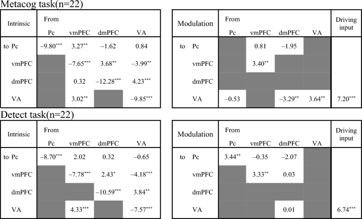 1. The upper and lower sections correspond to Fig. 3. The values in each cell are the t-values of the one-sample t-test for each pathway (df = 21, *** p < .001, ** p < .01, * p < .05 corrected for multiple comparisons with the FDR method). Gray cells indicate that the pathway was dropped during model selection, and the final model did not assume considerable participation.