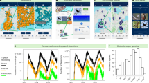 To determine the effects of the methodology on the diversity assessment, we measured the alpha and beta diversities for all sites. The alpha diversity of CS and Nation data was assessed using two indices: the number of species and the Shannon index at each site. It was assessed using the diversity function in the vegan package in R ver. 4.2.1 (69; R Core Team, 2022). Beta diversity was measured by community dissimilarity using presence-absence data based on the Sørensen pairwise species dissimilarity (βSOR), which measures the proportion of taxa not shared by each site70. Dissimilarity analysis based on presence-absence data gives more weight to rare species, considering that common species found at most sites contribute little to between-site differences71. We used beta.multi functions in the betapart package in R ver. 4.2.1 (72; R Core Team, 2022) to calculate the Sørensen dissimilarity. Additionally, we partitioned this dissimilarity additively into turnover (Simpson dissimilarity, βSIM), representing the replacement of some species by others, and nestedness (βSNE), a measure sensitive to species loss (or gain) components41,73. For the diversity analysis, we used only winter data for comparison between CS and Nation. The significance test of the diversity values between CS and Nation was computed using the stats package in R ver. 4.2.1 (R Core Team, 2022).