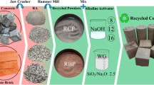 In this study, waste bricks and concrete were crushed with a jaw crusher and were then passed through sieve No. 50 (300 µm) to get RBP and RCP, which were then utilized as binders to make brick samples and geopolymer mortar. Moreover, an activating alkaline solution comprising an industrial sodium hydroxide solution (NaOH with 98% purity) and sodium silicate solution (water glass with SiO2/Na2O:3) was utilized. Additionally, sand that passed through sieve No. 4 (4.75 µm) and remained on sieve No. 8 (2.36 µm) was employed in the samples that included filler. RBP was also used in previous studies to create geopolymer samples since it contains pozzolanic aluminosilicate compounds49,60. Furthermore, RCP can be utilized to alter the properties of geopolymer samples—which will be covered in depth in this study—because of its high calcium concentration.
