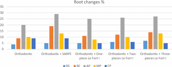 Table 2 presents percentage of root resorption and remodeling of the five treatment types for all patients and all teeth. The least percentage of root resorption among groups was orthodontic followed by SARPE, one-piece Le Fort I, two-pieces Le Fort I and three-pieces Le Fort I respectively. In addition, results indicated that SARPE group had the highest percentage of root remodeling, followed by three-pieces Le Fort I , two-pieces Le Fort I, one-piece Le Fort I, and finally the orthodontic group. Root remodeling was the largest in the apical part with a range between 20 ± 0.24% and 29 ± 0.16%.