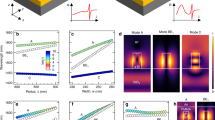 By following the general derivation of the parametric FWM gain from Ref.20, we can limit the calculation to a set of three coupled nonlinear equations since the pump fields cannot be distinguished on the basis of their frequencies, polarization, or spatial profile in the present case. Our analysis assumes an undepleted pump but it includes the frequency-dependence of overlap integrals. We find that the corresponding effective phase-mismatch becomes \(\Delta k = \Delta \beta - 2\gamma _{p,p}P_0 + 2\gamma _{s,p}P_0 + 2\gamma _{as,p}P_0\), where \(\Delta \beta =\beta ^s_1 + \beta ^{as}_1 - 2\beta ^p_1\) is the phase-matching condition in the linear regime; \(\gamma _{p,p}\), \(\gamma _{s,p}\) and \(\gamma _{as,p}\) denote the effective nonlinearity coefficients for pump’s self-phase modulation (SPM), pump-induced cross-phase modulation (XPM) of Stokes and anti-Stokes bands, respectively; and \(P_0\) is the input peak power (here: in the fundamental mode, 85% of 60 kW). The gain g depends on the pump power and is defined as \(g=\sqrt{(\gamma _\text{FWM}P_0)^2-(\Delta k / 2)^2}\). The maximum gain (\(g_\text{max}\)) is then achieved for \(\Delta k = 0\), thus \(g_\text{max} = \gamma _\text{FWM}P_0\), with \(\gamma _\text{FWM} = \sqrt{\gamma _{s,as,p,p}\gamma _{as,s,p,p}}\) being the effective nonlinearity for the intramodal FWM process. Figure 4 compares some experimental gain measurements along the fiber length (Fig. 4a) with theoretical predictions for two peak powers (Fig. 4b,c). Estimation of experimental gain was possible only for the anti-Stokes wave in the visible region, based on several recordings of spectra as shown in Fig. 2c. Such a gain inference over very short propagation distances is tricky. As shown by our two data sets for the same power of 51 kW in the fundamental mode, the gain estimation strongly depends on the cutback increment (indicated by horizontal segments in Fig. 4a). Nevertheless, our gain measurements agree well with our theoretical predictions close to 400 dB/m. Our measurement also shows the complete saturation of the FWM process after 0.7 m as the gain rapidly drops to zero. It is also worth to mention that our theoretical phase-matching \(\Delta k\) (including contributions of SPM and XPMs) correctly predicts the spectral positions of the Stokes and anti-Stokes at 3.545 \(\upmu \hbox {m}\) and 0.626 \(\upmu \hbox {m}\), respectively.