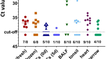 Overall, PCV4 was detected in 44 of the 512 samples (8.6%) [95% CI; 6.3–11.3] occurring in lung 9/100 [9%; 95% CI; 3.4–14.6], feces 5/100 (5%) [95% CI; 0.7–9.2%], spleen 9/100 (9%) [95% CI; 3.4–14.6%], serum 10/100 (10%) [95% CI; 4.9–17.6%], and lymphoid tissue 12/64 (18.7%) [95% CI; 9.1–23.8%] (Fig. 1A). Interesting, PCV4 was not detected in the fetus samples (0/48, 0%). The overall average PCV4 Ct value was 33, ranging from 21.3 to 36.2. Additionally, the average Ct value between different sample types was not significantly different (p > 0.05) (Fig. 1B).