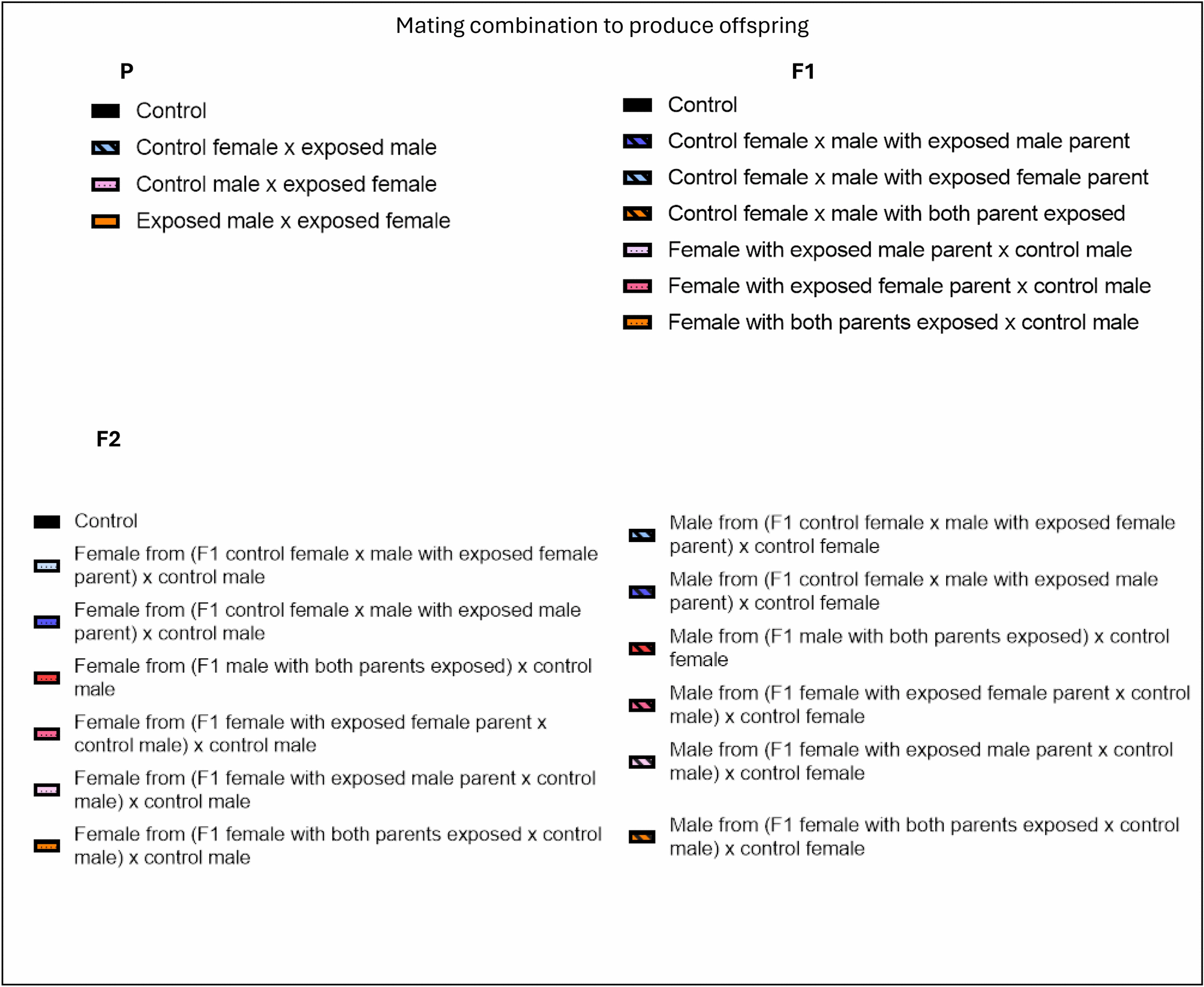 Newly eclosed F2 generation flies were removed and housed into sex-specific groups on standard food as they hatched, to prevent mating. The F2 generation was then bred as described above in the following groups: