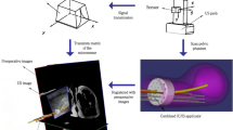 The 3D US system and related fusion techniques were approved for a proof of concept clinical study (NCT# 04705467) at Western University (London, ON, Canada) in accordance with our institution’s Research Ethics Board and Health Canada’s investigational testing authorization (ITA) guidelines and regulations. Two patients who were previously diagnosed with a malignant neoplasm of the cervix uteri and were scheduled to receive HDR gynecologic brachytherapy were enrolled in the study and provided written informed consent. The first patient (P1) was a 47-year-old female who received two insertions of a ring-and-tandem applicator (no interstitial needles). The second patient (P2) was a 53-year-old female who received two insertions of a tandem-and-ovoids applicator. Apart from the addition of 3D US imaging, the clinical workflow adhered to our institution’s standard of care. In both cases, with the patient in the lithotomy position and after the administration of general anesthesia, our 3D TRUS mover and stabilizer arms were attached to the operating room bed (Fig. 1b). As is the usual practice of our institution, a Foley catheter was inserted into the patient’s bladder, and the bladder was filled with approximately 100 mL of fluid. Next, the brachytherapy applicator was placed within the patient under 2D US guidance by the attending radiation oncologist. The TRUS system was placed into the rectum, and both 3D TRUS and 3D TAUS imaging were performed with the applicator in place. The pull-back method described in Section “Phantom Study” was used during the patient procedures to ensure a full FOV with the endocavity transducer. Both patients were imaged using sterilized US coupling gel, with 3D TAUS depth settings of 13 cm and 15 cm for P1 and P2, respectively, and 3D TRUS depth settings of 8 cm and 10 cm for P1 and P2, respectively. The total time for image acquisition using both 3D US systems ranged from approximately 1–5 min, depending on factors such as the number of images captured and the duration of review by the radiation oncologist. After image acquisition, both 3D US systems were removed from the operating room prior to patient recovery, thus ending the intraoperative imaging portion of our study. Next, typical CT and MR simulation imaging were performed for dose planning purposes approximately 2 h after the applicator insertion, with the patient’s legs lowered into a supine position. The images from the planning modalities were de-identified and used as gold-standard comparisons for the fusion study. Offline, the 3D US images were fused, analyzed, and compared to the gold standard in the manner described in Section “Registration and Fusion” and Section “Image Analysis” by two observers who received image analysis training from multiple clinical medical physicists. Specifically, three points were identified on both the 3D TAUS and 3D TRUS images and used as landmarks for fiducial analysis as no physical fiducial markers were placed within the patient during these procedures.