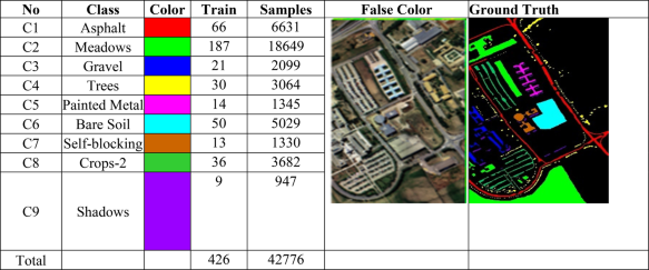 Table 2 Pavia University labeled Samples [We have used the raw data to draw the satellite imagery in Table 2 from the publicly available dataset at the GitHub repository, where we have already mentioned the link in our previous manuscript in the data availability section (https://github.com/gokriznastic/HybridSN/tree/master/data). Moreover, the classification maps in Table 2 were generated using the PHYTON 3.8 version and are publicly available at Pytorch library https://pytorch.org/get-started/locally/. Which is installed on NVIDIA RTX 3060 GPU with 64 GB RAM].