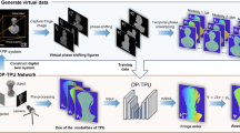 Table 1 presents a comparison of the MAE and RMSE for the four measurement methods. Only the data with \(3\delta\) of the statistical data are considered valid21. The traditional multi-frequency TPU technique is widely used for its high accuracy, exhibiting the smallest MAE and RMSE. However, it requires nine patterns for reconstruction. The dual-frequency geometric-constraint method demonstrates high precision but necessitates the use of six patterns for reconstruction. In contrast, the single-frequency geometric-constraint TPU method exhibits larger errors and requires three patterns for reconstruction. Our proposed method offers a balance between accuracy and efficiency. Although it has larger errors compared to the traditional multi-frequency TPU method and the dual-frequency geometric-constraint method, its accuracy is better than the single-frequency geometric-constraint TPU method. The most significant advantage of our proposed method is its efficiency, which could achieve a 3D surface measurement using only three images.