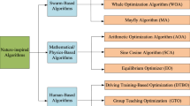 Moreover, meta-heuristic optimization algorithms, depending on their simulation objects and methodologies8,9, can be classified into four main categories (Fig. 1): evolution-based, physics-based, human-based and swarm-based methods. Evolution-based algorithms are inspired by Darwin and Mendel’s theories of natural evolution, simulating the selection and reproduction processes of biological entities in their environment. Some of the most popular algorithms are genetic algorithm (GA)10, differential evolution (DE)11, genetic programming (GP)12, evolutionary mating algorithm (EMA)13, gene expression programming (GEP)14. And some enhanced versions of DE are also widely used in engineering optimal design, such as self-adaptive differential evolution with neighborhood search (SaNSDE)15 and adaptive differential evolution with optional external archive (JADE)16.