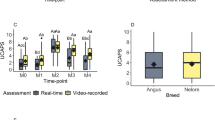 Scoring drift among observers when using pain scales has been well-documented52. Intra-observer reliability of the reference observer varied from 0.32 to 1 in the Nellore20, Holstein19 and sow53 grimace scales, while the inter-observer reliability varied from 0.42 to 0.77 for the Holstein19 and sow53 grimace scales. RO, who was responsible for scoring the images for the subsequent analyses, achieved high inter and intra-observer reliability (ICC > 0.8), confirming that the scoring is accurate, yielding consistent results both between different observers and across repeated observations by the same observer. This result implies pain assessment in farm animals could be as accurate and reliable as in other species, such as cats and ferrets, where the inter- and intra-observer reliabilities were above 0.8029,45.