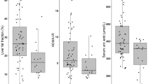 Of the study cohort, 38% had high BMI (overweight/obese). Whilst most plasma biochemical markers were in reported normal ranges48, 11% had HbA1c in the prediabetic range (Table 2). The high BMI group had higher fasting insulin (p = 0.001) and triglyceride levels (p < 0.001), alongside lower serum HDL (p < 0.001), than the low BMI group (Table 1). Similarly, biochemical markers of liver health were also in the normal range, but AST (p = 0.023), ALT (p < 0.001), ALP (p = 0.008) and direct bilirubin (p = 0.015), were higher in the high BMI group compared to the low BMI group. In addition, both diastolic (p = 0.006) and systolic (p = 0.013) BP were also higher in the high BMI group (Table 1). Inspection of a Manhattan plot where individual datapoints are shown for the liver transaminases and selected measurements that contribute to the IDEFCS MetS risk score, many of the abnormal values are from subjects with MetS risk score of 1–2 or ≥ 3, but some are also from subjects that have no MetS risk factors (Fig. 4A).