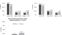 Emotional exhaustion, depersonalization and personal accomplishment were measured with the Maslach Burnout Inventory: Human Services Survey for Medical Personnel25. The emotional exhaustion (nine items), depersonalization (five items), and personal accomplishment (eight items) were each calculated as the sum of items scored 0 to 6. Across time points, Cronbach’s alpha ranged from 0.94 to 0.96 (emotional exhaustion, n = 289), 0.84-0.90 (depersonalization, n = 82), and 81-0.89 (personal accomplishment, n = 82).