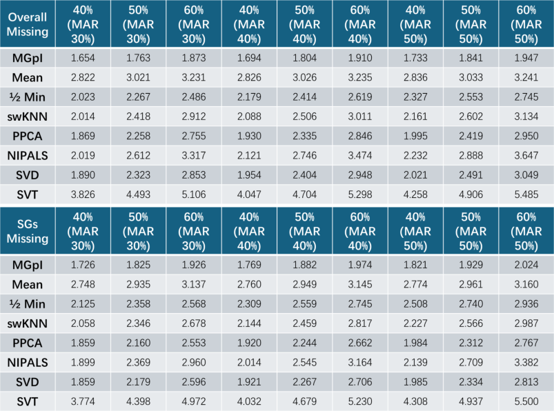 Table 2 Imputation accuracy achieved by MGpI compared with seven peer methods on realistic simulation data (single-cell RNA Seq data of heart tissue) embedded with ground truth and measured by RMSE (overall and SG-focused).