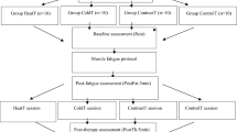 Three variations of a unilateral exercise protocol based on concentric and eccentric muscle actions were used to induce muscle damage and DOMS was used based on previous studies with similar goals23,33. The dumbbell biceps curl exercise involved elbow flexion (concentric phase) and extension (eccentric phase) performed with the non-preferred arm holding a dumbbell of 3 kg for men and 2 kg for women34. These magnitudes of dumbbell masses were defined according to a previous study23. Participants exercised seated on a bench, with the non-exercised arm relaxed along the body. The movement speed was set at 40 repetitions/min, controlled by a metronome. A researcher continuously provided verbal feedback regarding the quality of movement. The three exercise protocols are described below: