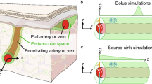 The model domain is described in terms of extracellular pressure \(p\), fluid flow velocity \({\varvec{v}}\), and displacement \({\varvec{u}}\), all as functions of blood osmotic imbalance \(\Psi\) (see Supplementary Information for details). We define \(\Psi\) as \(\Psi ={p}_{\text{blood}}-\Pi\), where \({p}_{\text{blood}}\) is the average blood pressure, and \(\Pi\) is the osmotic pressure on the blood brain barrier given in the van ‘t Hoff approximation for dilute solutions as \(\Pi =RT\Delta c\), (with \(\Delta c\) the osmolyte concentration difference, \(R\) the gas constant and \(T\) the temperature)13. We take \(\Psi\) to be constant for simplicity. We measure pressure relative to cerebrospinal fluid pressure in ventricles and subarachnoid spaces and take these to be equal.