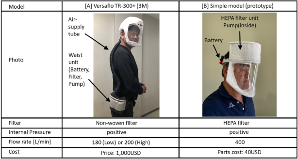 Table 1 Specifications of two Powered Air-Purifying Respirators (PAPRs) (The PAPR wearer shown in the photos is Prof. Yusaku Fujii.)