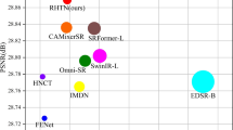 Recently, Transformer18 has attracted the attention of computer vision community due to its success in the field of natural language processing. A series of Transformer-based methods15,19,20,21,22,23,24,25,26,27,28,29,30,31 have been developed for high-level vision tasks, including image classification15,20,25,32,33,34,35, object detection15,30,36,37,38, segmentation28,34,39,40, etc. Despite the demonstrated superiority of the vision Transformer in modeling long-range dependencies20,41, numerous studies have highlighted the potential of convolution to enhance the visual representation of Transformer22,24,31,42,43. Because of its outstanding performance, the Transformer has also been implemented for tasks related to low-level vision10,11,12,13,44,45,46,47,48. Specifically, IPT11 devises a ViT-style network and incorporates multi-task pre-training for image processing purposes. SwinIR10introduces an image restoration Transformer model inspired by15. VRT45presents Transformer-based architectures for video restoration tasks. EDT12 incorporates a self-attention mechanism and a strategy of pre-training across multiple related tasks. HAT13 integrates self-attention, channel attention, and a novel overlapping cross-attention mechanism to activate a greater number of pixels, thereby enhancing the quality of reconstruction and further advancing the state-of-the-art in SR. Although Transformer-based methods in the field of super-resolution have made significant progress in performance metrics such as PSNR and SSIM, challenges still exist in terms of model computational complexity and parameter quantity, which hinders the practical deployment and application of super-resolution models. We use spectral transform block based on an invertibility spectral network instead of the standard self-attention network and reduce the number of transformer layers, thus achieving a reduction in model computational complexity and number of model parameters while maintaining model performance metrics (Fig. 1).