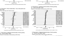 Table 1 provides the distribution of descriptive statistics (weighted counts and proportions). Participant ages ranged the entire adult lifespan (18–80 +). The sex (“gender”) distribution was nearly balanced with 51% female, 48% male, along with a small representation from other gender identities (0.3%). Most participants reported either having a somewhat good or very good relationship with either parent while growing up. Regarding attending religious services growing up, 41% of participants report attending at least once a week while 23% of participants report never attending. Counts and proportions for demographic characteristics weighted to be representative of each country’s population are reported in supplemental Tables S1a-S22a.