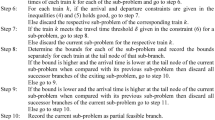 In Eq. (21), RC is the reduced cost calculated with the dual variable values (shadow prices of the resources) for each constraint in the restricted master problem model, where \({\pi _i}\)\({\lambda _d}\)\({\rho _d}\)\({\omega _d}\)\(\mu\)are the dual variable value in the Model(1–5) from constraint Eqs. (2), (3), (4), and (5) respectively. Constraint (22) indicates that each train node in the network can be accessed only once per path. Constraint (23) indicates that each EMU can only return to its home-depot for maintenance. Constraint (24) indicates that the mileage accumulated since the last maintenance task should not exceed the mileage specified in the maintenance regulations. Constraint (25) indicates that the time interval from the previous maintenance task to the next maintenance task should not exceed the time specified by the maintenance regulations.