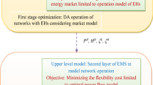 EHs are a unit integrating renewable and non-renewable resources, storage devices and demand response programs. EH has different types of energy such as electricity, gas and heat in its input and output. This issue is also present in the energy hub used in this article. There are electricity and heat energies in the input and output of the hub. In this design, only renewable resources were used, so that the hubs have low environmental pollution. An important feature of the hub used in this study compared to the research background9,10,11,12,13,14,15,16,17,18 is the supply of thermal energy from renewable sources. So that according to Fig. 1, BU, FC and HP are thermal energy producers. BU is a renewable source; HP supplies its input electrical energy from renewable sources. FC also receives hydrogen from HT at its input. Hydrogen is also obtained from renewable sources by electrolyzer. This feature is due to the use of CHP in HS and BU. In addition, according to Sect. 1.3, batteries were generally used in hubs. Although this storage device has high efficiency and power density, its useful life is short and it has high installation cost. The hub used in this research uses CAES and HS. These storage devices have long useful life and low installation cost. There is also a good efficiency for them. In addition, HS can be equipped with CHP, which makes HS play a role in providing thermal energy and increase its working efficiency.