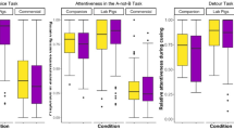Test sessions took place over five consecutive days and consisted of five experimental conditions (joint log-lift, asocial, individual log-lift, log up – empty, log up – full; see “conditions” section below). The procedure across test conditions was similar. Prior to the test session, one of the boxes was brought into the subject’s compartment of the test enclosure and set up against the back wall, with the front panel(s) of the box closed. The choice of box, whether the food bowls inside the box were baited, the position of the log, and whether a partner was present in the adjacent enclosure, all depended on the experimental condition. Directly before each experimental session, the dyad was brought to the test enclosure. They were directed into the partner’s enclosure and remained there together for 1 min to allow them to settle. In one of the experimental conditions (see below), no partner was present; thus, the subject was brought to the partner’s compartment of the test enclosure alone. After 1 min had elapsed, the small door between the compartments was opened and the subject was directed through this door into the subject’s compartment. The small door was closed again immediately and all three door handles in the subject’s compartment were covered by wooden covers attached to long wooden handles which were held by the experimenters from outside the enclosure. The subject remained in this compartment, with the door handles covered and the front panel of the box closed, for 30 s to allow a settling period before the session began. After 30 s had elapsed, the front panel(s) of the box was (were) lifted and the covers on the door handles were removed. The subject was then given a 5-min testing period. We provided the pigs with a 5-min testing period based on our subjective assessment of how much time would be sufficient to open the door and lift the log. If a log was lifted in this session, it was not reset. Similarly, if the small door was opened by the pig, it was not closed again by an experimenter. During the 5-min test session, one experimenter stood outside the enclosure behind the box and was visible to the pigs. The second experimenter stood approximately 2–3 m away from the enclosure and was not visible to the pigs. After this 5-min test session had elapsed, the front panel of the box was closed and both pigs were removed from the test enclosure. The roles of the two experimenters remained consistent throughout the entire testing period. An example of the procedure can be seen in the Supplementary video ESM_2.