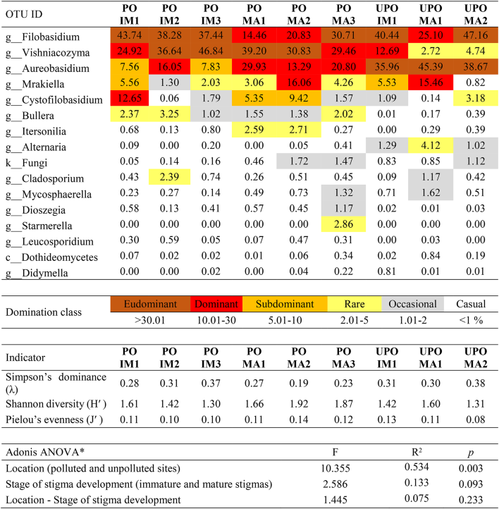 Table 4 Fungal community composition and diversity indices identified in Orobanche lutea in immature stigmas from closed flowers (IM) and mature stigmas from opened flowers (MA) of polluted (PO) and unpolluted areas (UPO)