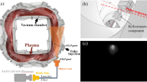Heliotron J is a helical-axis heliotron with a major radius of 1.2 m, an averaged plasma radius of a = 0.17 m, a plasma volume of 0.68 m3, and a magnetic field strength on the axis of 1.28 T14,15. Figure 1 shows the temporal evolution of the typical parameters with pellet injection in Heliotron J. The target plasma was produced with electron cyclotron resonant heating (ECRH) of 0.243 MW at the plasma center (70 GHz, 2nd X-mode heating). The working gas was deuterium. At t = 241.4 ms, a hydrogen pellet was injected at a speed of 200–300 m/s16. The injected pellet was cylindrical, with a diameter of 0.7 mm and a length of 0.8 mm, and contained 1.6 × 1019 hydrogen atoms. The pellet penetrated close to the magnetic axis, supplying cold electrons and hydrogen ions through the ablation process. The expected increase in the averaged density, based on the number of atoms in the pellet and the plasma volume, is 2.3 × 1019 m−3. The averaged electron density, \({\overline{n} }_{\text{e}}\), was measured with a micro-wave interferometer (130 GHz) and fractional error is less than 1%, if the noise level is estimated from the root-mean-square value of the \({\overline{n} }_{\text{e}}\) in the absence of plasma. Pellet fueling caused the \({\overline{n} }_{\text{e}}\) to rapidly increase from 0.2 × 1019 m−3 to 2.4 × 1019 m−3 as shown in Fig. 1(a), which is roughly consistent with the expected increase (here the instantaneous \({\overline{n} }_{\text{e}}\) during ablation could not be traced due to fast fringe jump problem17. On the other hand, the stored energy, Wp, measured with a diamagnetic loop, decreased (Fig. 1(b)). This decrease is partly due to increased radiation losses and partly due to the formation of a peak density profile, as measured with a Thomson scattering system18, where the plasma center exceeds the cutoff density (3 × 1019 m−3), which limits ECH absorption and lowers the absorbed power. We observed that the Wp increased abruptly 10 ms after the pellet ablation was completed. This phenomenon closely resembles reheat mode observed in CHS and other stellarator/heliotron devices in terms of the recovery of Wp, the electron density peaking, and the increase in electron temperature in the periphery region19,20,21. Reheat is considered to be a common phenomenon in pellet-injected plasmas. Reheat mode has also been observed in supersonic molecular-beam injection (SMBI) discharges in Heliotron J22,23. However, the mechanism remains unclear.
